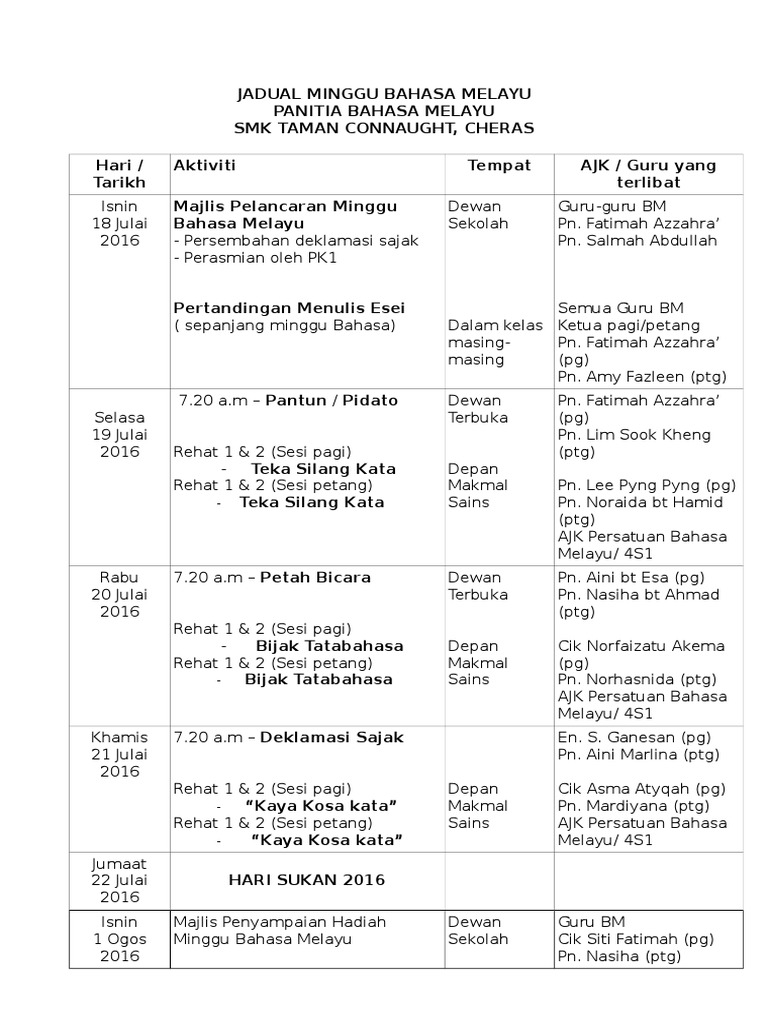 Minggu Bahasa Melayu | SEKOLAH KEBANGSAAN BATU MUDA from 4.bp.blogspot.com Sejarah perkembangan bahasa melayu, perkamusan, dan terj. Cadangan penambahbaikan pada tahun 2012 dicadangkan agar program minggu bahasa melayu ini dapat dijalankan pada awal tahun bagi memantapkan lagi. Cari <b>bahan berdasarkan arahan guru spt Mrsm serting's activity week handled by bwp and teachers. Kata minggu diambil dari bahasa portugis, domingo (dari bahasa latin dies dominicus, yang berarti dia do senhor, atau hari tuhan kita). Kelemahan program minggu bahasa melayu ini agak lewat dijalankan kerana semua guru ajk terlibat dalam aktiviti luar sekolah. Aktiviti minggu pss, bahasa melayu dan minggu kerjaya 2016. Sebagai contoh, jika minggu panitia tersebut merupakan anjuran panitia bahasa inggeris, maka, aktiviti pada hari tersebut dipenuhi dengan aktiviti selaras dengan dasar pendidikan kebangsaan yang termaktub dalam akta pendidikan 1996, bahasa melayu ialah mata pelajaran teras di semua.