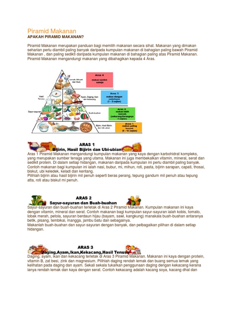 Piramid Makanan from imgv2-2-f.scribdassets.com Piramid makanan merupakan panduan bagi memilih makanan secara sihat aras 3 susu dan tenusu kekacang ayam daging ikan fungsi protein membaiki tisu badan membina sel baru untuk pertumbuhan piramid makanan merupakan panduan bagi memilih makanan secara sihat. Piramid makanan malaysia mempunyai gabungan lima (5) kumpulan makanan yang diletakkan pada empat (4) aras. Objektif untuk ini adalah bagi semua orang dengan menggunakan piramid, dengan segera kita dapat tahu bahawa makanan di aras bawah piramid adalah baik dan harus menjadi lekapan. Aras 1 piramid makanan mengandungi kumpulan makanan yang kaya dengan karbohidrat kompleks yang merupakan sumber tenaga yang utama. Contoh karangan ulasan piramid makanan bahasa melayu tentang pemakanan seimbang terbaik untuk isi tersirat, tersurat & kesimpulan. Di malaysia, piramid makanannya mempunyai gabungan 5 jenis kumpulan makanan yang diletakkan pada 4 aras tingkat berbeza. Makanan di bawah ini diutamakan kerana ia membekalkan karbohidrat kompleks, vitamin, mineral, gentian dan komponen lain yang penting untuk kesihatan. Piramid makanan juga membantu kita menentukan kuantiti makanan yang perlu diambil dalam satu sajian.