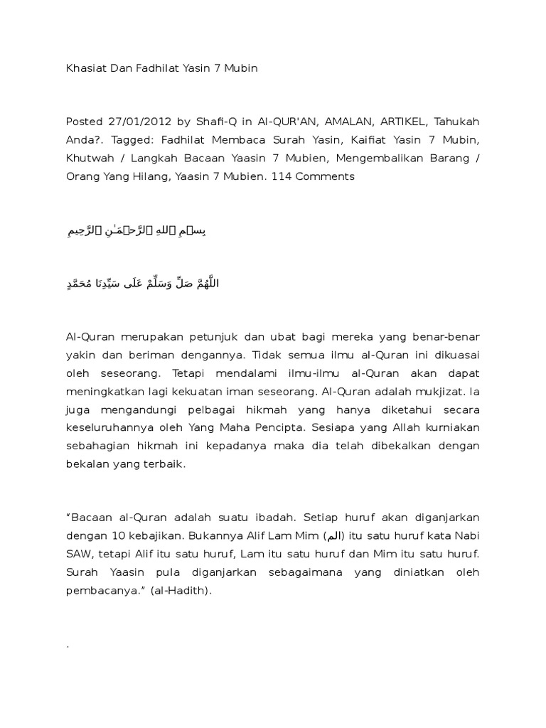 Yasin kur'anı kerimin en fazla okunan ve okunması makbul olduğu bildirilen surelerden biridir. Bilindiği gibi yasin suresinde yedi yerde mübin kelimesi geçmektedir.bunlar 12,17,24,47,60,69 ve 77. Kaifiat yasin 7 mubin mubin pertama. Kembalikan sihir kepada penyihir/yasin 7 mubin: Return shir to sender mp3 duration 55:13 size 126.38 mb / thehealingsoul 1.